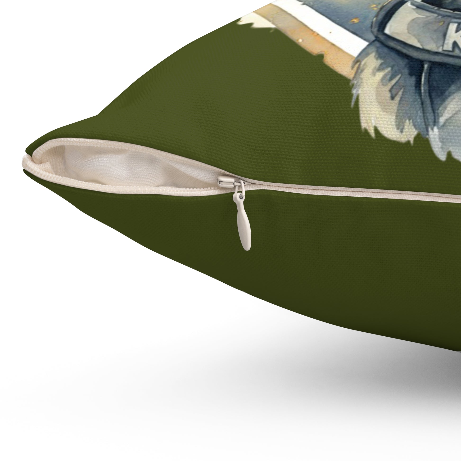 A square spun-polyester pillow featuring a dignified K9 German Shepherd portrait set against a muted olive backdrop and a soft, vintage-styled scene. The double-sided print maintains rich, fade-resistant color while the concealed beige zipper keeps the silhouette clean. When the recycled polyester insert is added, the cover fills out into a plush, full cushion that brings a quiet, steadfast energy to a couch, patrol-room bench, or reading nook. This pillow sits easily in homes that honor service animals and public-safety stories — a subtle tribute that blends function with heartfelt character.