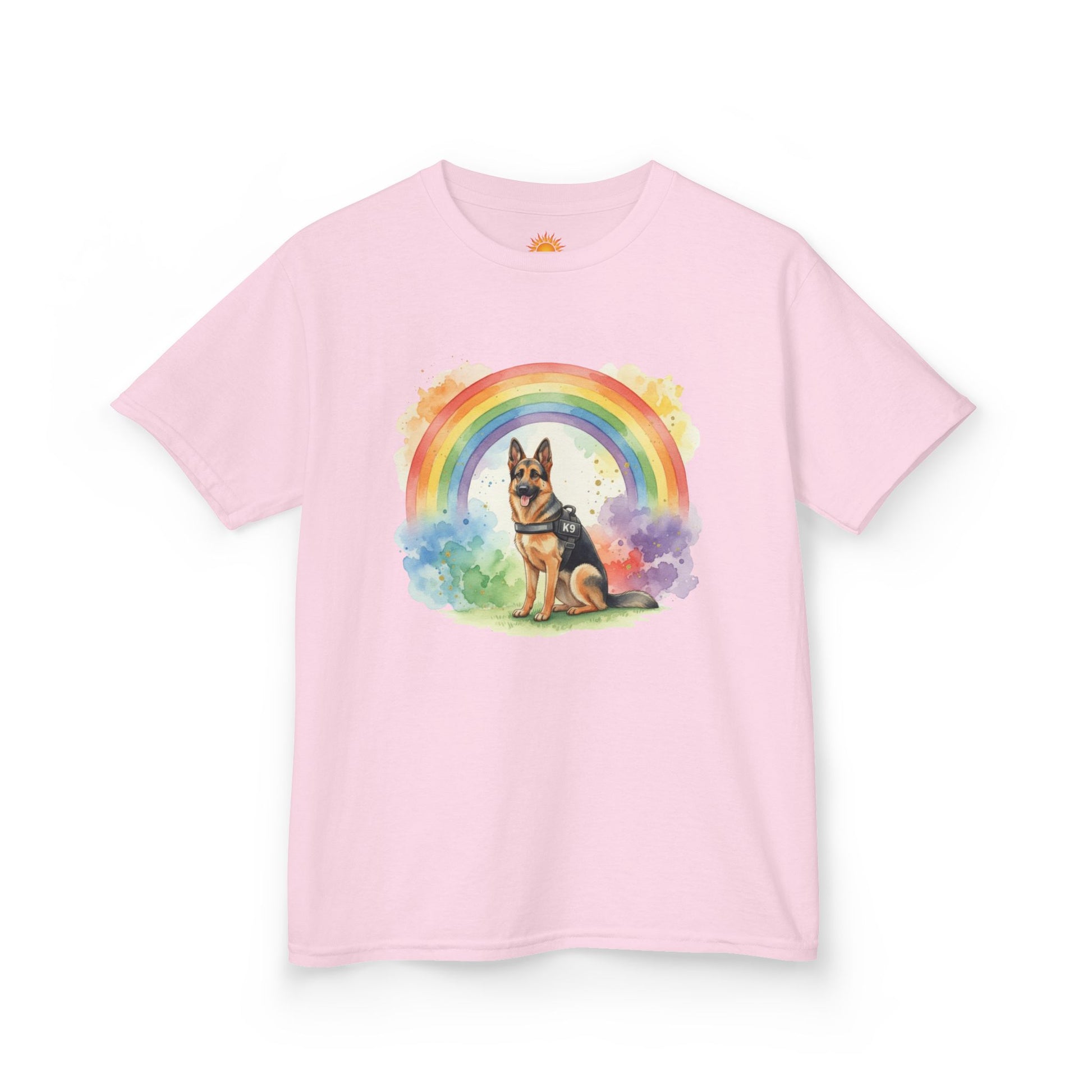Kids German Shepherd Tee — Rainbow Watercolor Pup T-Shirt